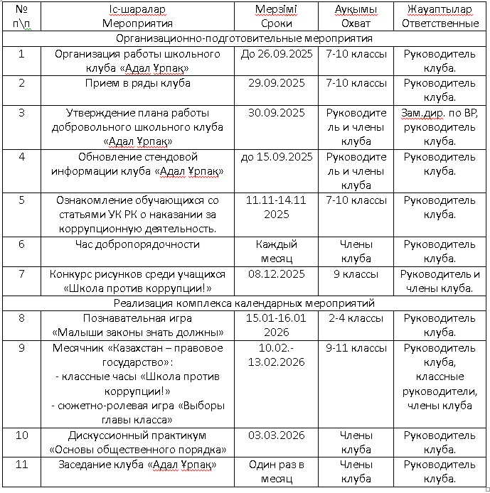 План работы добровольного школьного клуба «Адал Ұрпақ» 2025-2026 учебный год.